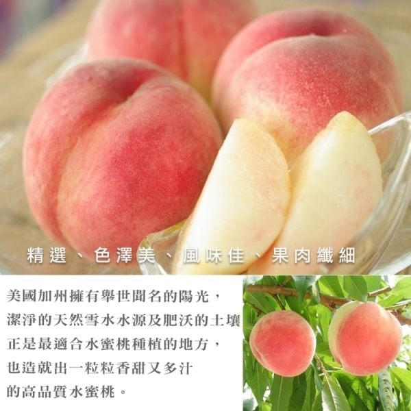 香甜多汁外,最重要的是其具有低熱量及具有豐富的營養價值,由於空運來台的美國水蜜桃須要經過一段的運輸過程,所以水蜜桃的採收必須在樹上快成熟的時候即便將其採下並完成包裝,讓水蜜桃受到良好的保護。