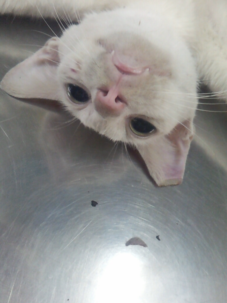 這隻白貓是在超商旁的浪貓~幾個月前生了小貓後壹直在附近帶著小貓們流浪~聽店員說最近可能發情了~所以趕緊誘捕~