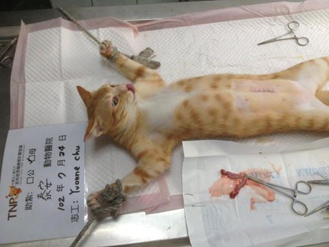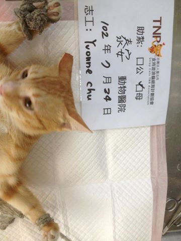 誘捕者暱稱: Yvonne49 性別: 母 花色: 橘 誘捕地點: 鳳山大明市場 結紮醫院: 泰安動物醫院 結紮費用: 1200 助紮者: 已付款:妞妞x4 額外醫療費用申請: 無 特別說明與誘捕心情: 這隻貓咪剛長大約八九個月大,長大的過程也是歷經千辛。牠曾經疑似被人下過毒,口吐白沫肚子整個發漲,經過手術才搶回一條小命。術後的牠一度病懨懨的,狀況不是十分理想,還好牠待的巿場攤商是賣吃的,每天都一邊煮一邊丟魚丸等食物給牠吃,牠才慢慢得恢復過來,如今小個兒的牠也開始發情了,看牠的狀況都還不錯了,才決定帶牠TNR,免得牠身體無法負荷懷孕和生產後育兒的狀況。感謝協會幫忙募款,更謝謝每一位捐款人您的善心大愛,幫助了這隻可憐的貓咪。