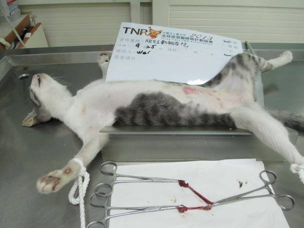 誘捕者暱稱: 小葦 性別: 母 花色: 灰白 誘捕地點: 忠孝東路 結紮醫院: 欣旺動物醫院 結紮費用: 1500 助紮者: 已付款:Kay Hsux5 額外醫療費用申請: 特別說明與誘捕心情: 跟朋友約在吃飯在路邊相等,突然聽見貓叫聲,好像有貓咪在車底下喵喵叫討食,趕緊請朋友回家拿誘捕籠,嘗試要捕捉,剛設好誘捕籠,貓卻在車底喵喵叫不敢靠近,車主又突然來開車,貓跑到對面車底,只好猛敲罐頭,貓一直有回應,但沒有看見蹤影,只好先躲起來看貓會不會靠近,五分鐘後聽到喀拉一聲,然後激烈衝撞的聲音,趕快把他先安置於朋友家中,發現他掙扎太厲害指甲斷裂,腳上都是血,用報紙將誘捕籠蓋好,吃完飯,回去發現他把罐罐都吃完,好像比較沒有撞的那麼激烈,送醫結紮已後就可以免於生育之苦。
