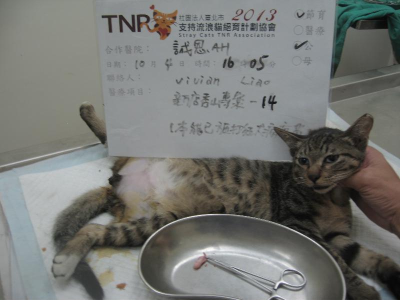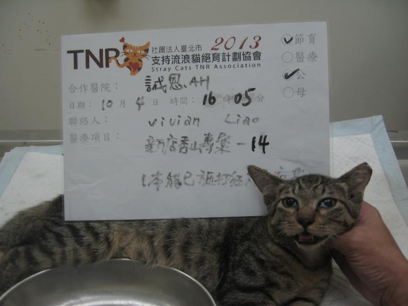 誘捕者暱稱: Vivian Liao 性別: 公 花色: 虎斑 誘捕地點: 新店秀山專案 結紮醫院: 誠恩動物醫院 結紮費用: 800 助紮者: 已付款:Rose Wangx3 額外醫療費用申請: 特別說明與誘捕心情: 【新店秀山專案】14