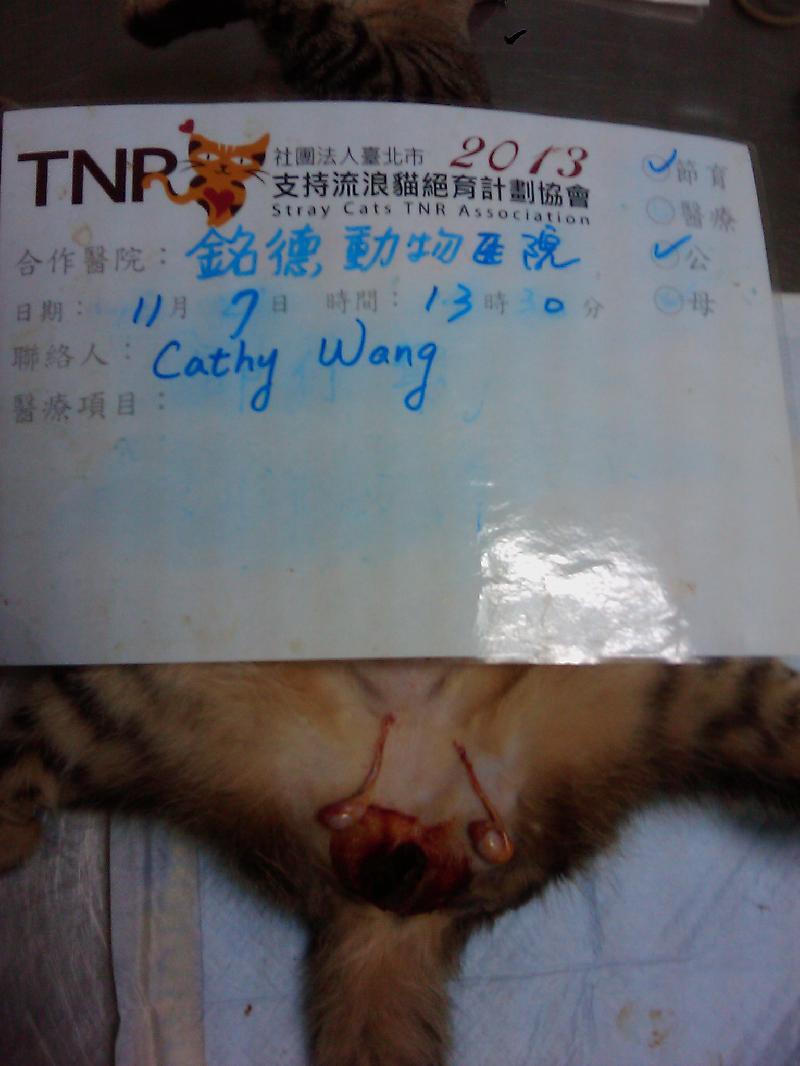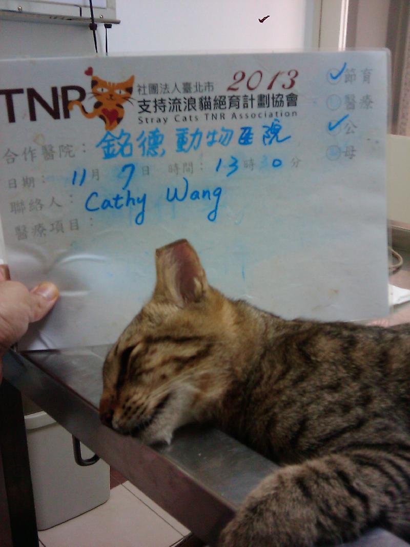 此為輔大周邊的浪貓,誘捕絕育後盼能幫貓咪擺脫生育之苦也施打了狂犬病疫苗,做為防疫的第一道防線。希望藉由TNR的實施更能順利與居民溝通,與讓居民了解只要有確實積極實施tnr,浪貓並不會帶來太大的問題,只要人貓試著彼此包容,浪貓共存並非難事。