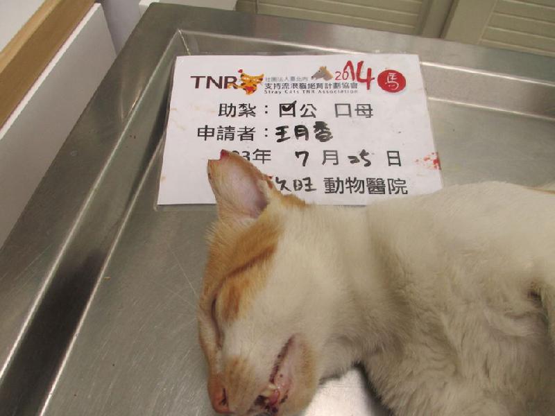 花色: 白底橘虎斑 誘捕地點: 台北市中山區行孝里