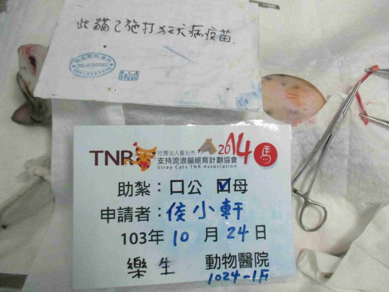 結紮醫院: 樂生動物醫院 結紮費用: 1200