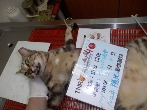 誘捕者暱稱: 臺北市支持流浪貓絕育計劃協會 性別: 公 花色: 虎斑 誘捕地點: 寺廟 結紮醫院: 陽光犬貓專科醫院 結紮費用: 800 助紮者: 已付款:Karissa Chuangx3 額外醫療費用申請: 特別說明與誘捕心情: 經購地庇護中心鄰居通報,