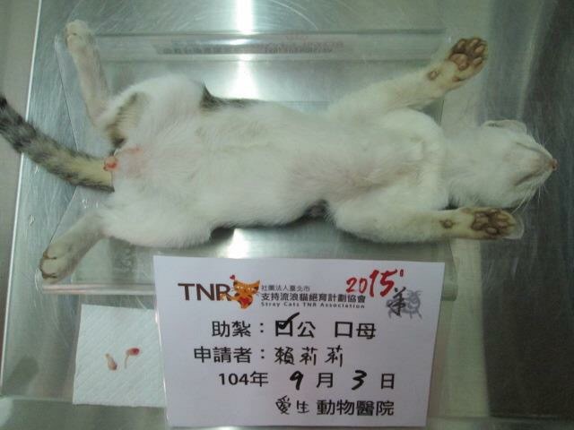 9月2日於林森路路口誘捕到,9月3日送至愛生醫院結紮,3日即可出院,謝謝協會幫忙與廣大捐贈者的愛心,讓浪浪得以與人們和諧共處。