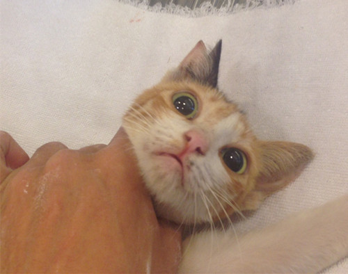 這是這裡剛長大的母貓,不太親人,但每晚都有來吃飯,很擔心她懷孕,所以趁她約五個月大的年紀趕緊抓。