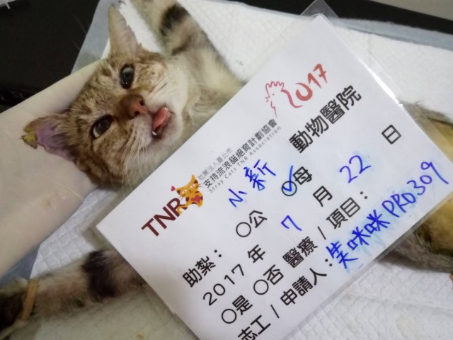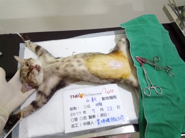 帶去醫院後請醫生先打了一點點麻藥,又剃了腹部的毛,醫生看了又看,摸了又摸,怎麼看都不像有結紮的痕跡。醫生說耳朵的缺口也不像是結紮的剪耳,反而像是受過傷的樣子。還好最後確定是沒有結紮過,沒有白白挨這一刀!