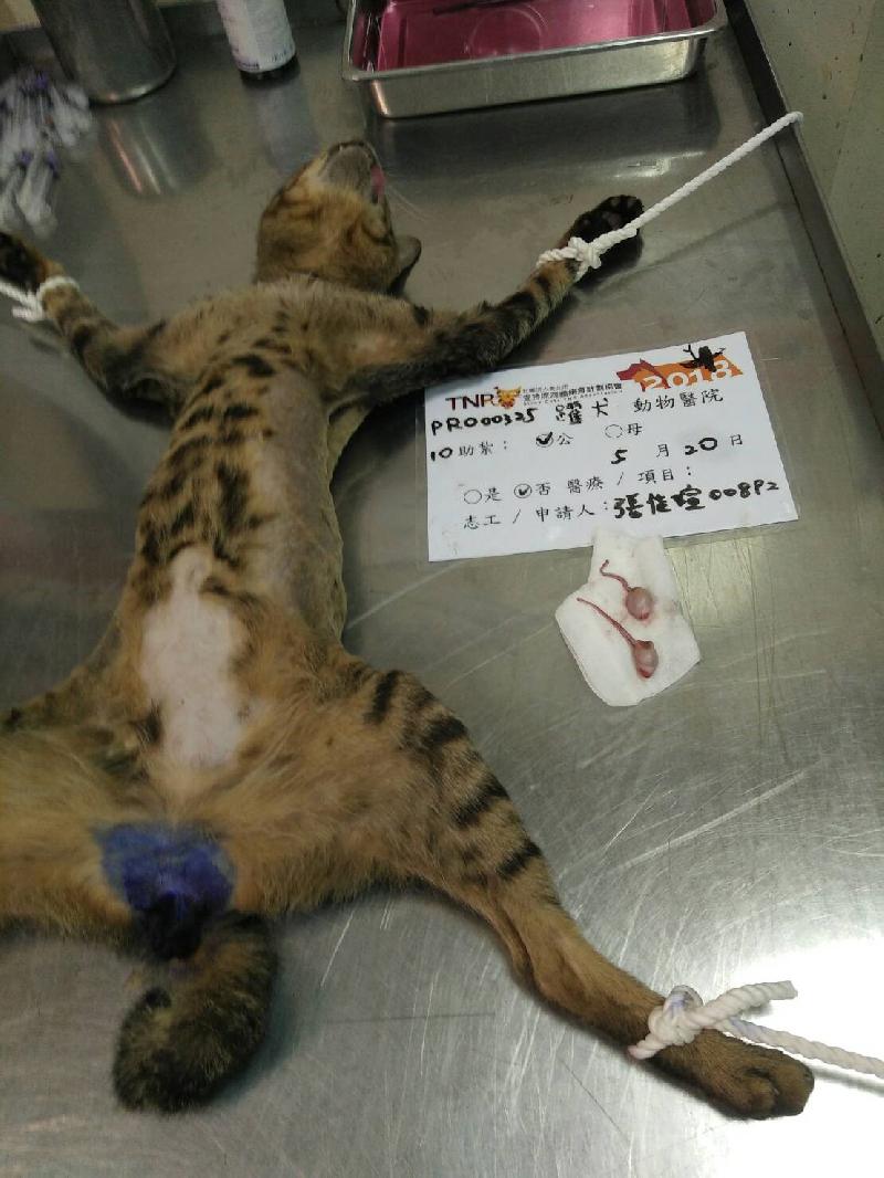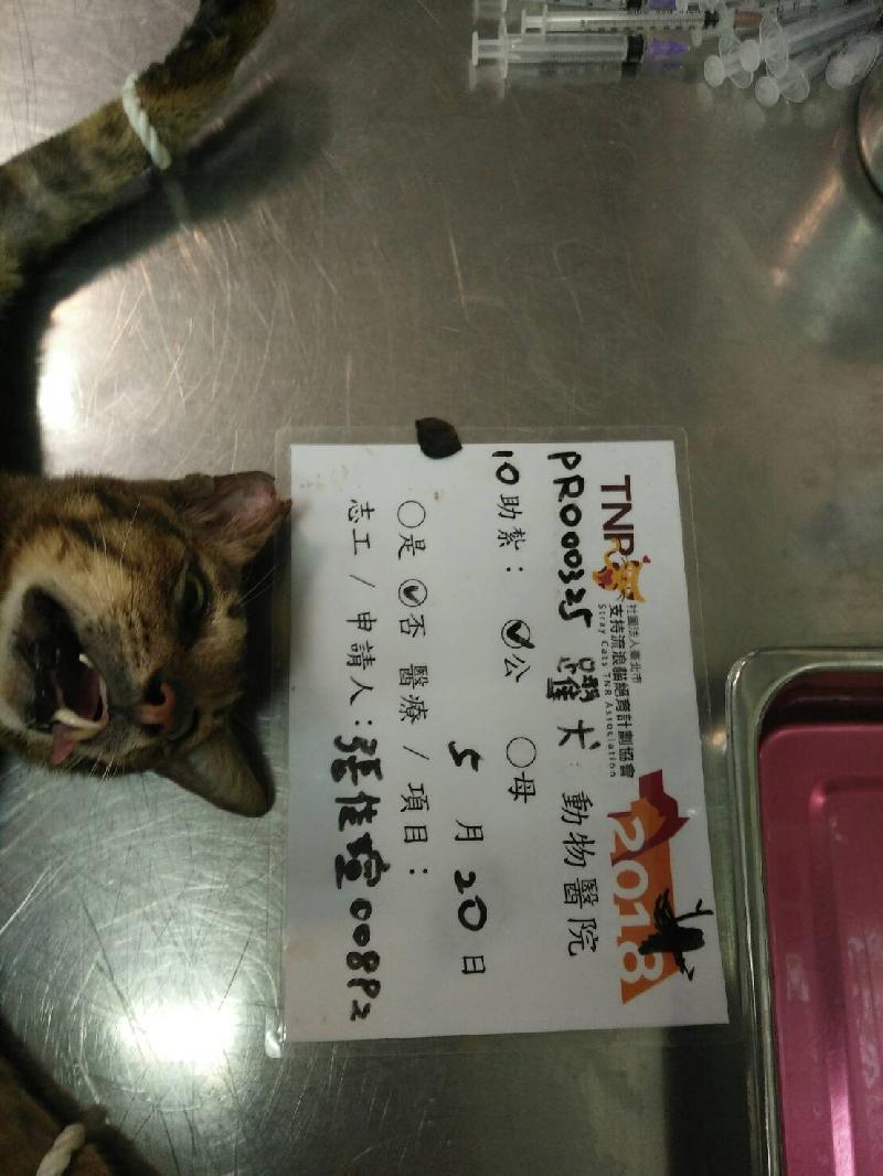 誘捕者暱稱: 張佳媗 性別: 公 花色: 虎斑 誘捕地點: 台南市安平區 結紮醫院: 躍犬動物醫院 結紮費用: 800 助紮者: 已付款:carrie08x2, 衛生紙x1, 衛生紙x1 額外醫療費用申請: 申請800元檢驗費用。其餘藥費和住宿費2400元由我和醫生、愛媽三人共同分擔。 特別說明與誘捕心情: 專案10, 這隻貓是在安平的城隍廟停車場附近抓到的。 剛開始遇到牠時,牠警戒心很高,不願意進籠,所以我就先抓其他貓結紮。這幾天再看到牠的時候就覺得牠異常消瘦,所以我就趕快用罐頭引誘牠進籠。送去結紮時我請醫生幫牠血檢,費用是800元,檢驗結果發現牠有血糖偏高,肝功能指數異常,和貧血的狀況。在醫生投藥之後已經有好轉,之後會交由當地餵養的愛媽先帶回去家裡照顧+投藥,省住院費,等貓咪的身體狀況更健康圓胖之後,再放回原地餵養。