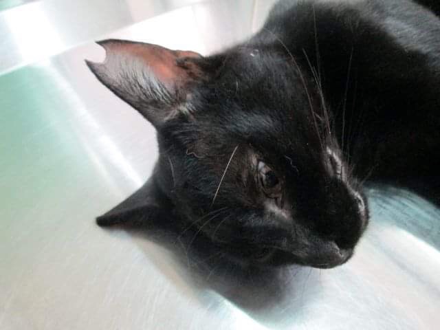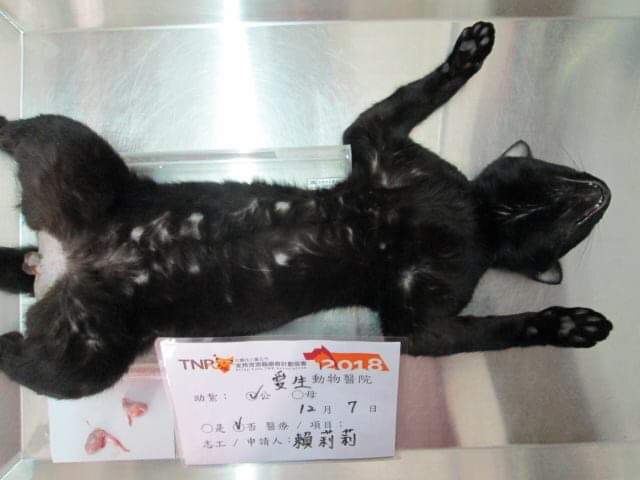 大黑最近出現在屏東市勝利東路與巷口,個性膽小,在這帶覓食已有段時間,店家試圖培養感情,希望能將他誘捕,於12/6晚上進行即成功,12/7早上送至愛生醫院,3天即可原放,謝謝醫生,謝謝協會,謝謝捐助人,謝謝。