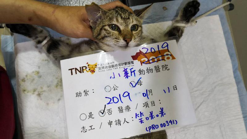 誘捕者暱稱: 笑咪咪 性別: 母 花色: 虎斑 誘捕地點: 南屏路 結紮醫院: 小新動物醫院 結紮費用: 1100 助紮者: 已付款:陳瑄x4 額外醫療費用申請: 特別說明與誘捕心情: 前陣子抓到同胎的哥哥後,這隻體型較小的小虎斑就一直是要抓的對象。但因剛開始要抓紮媽媽時這隻小虎斑曾貪吃入籠,又看到哥哥和另一隻同伴被誘捕籠抓到,所以她對誘捕籠有著非常大的戒心,不管放多香的食物,她都只把前半段的食物吃掉,就是不走到最後一步,所以最後只好出動用狗籠改裝的落罩式的大籠子。第一次用的時候,她仍然戒心很重,咬了又跑,害我不敢太快拉繩,隔天又再試一次,趁著她吃著正專心時趕快拉繩,終於抓到了。