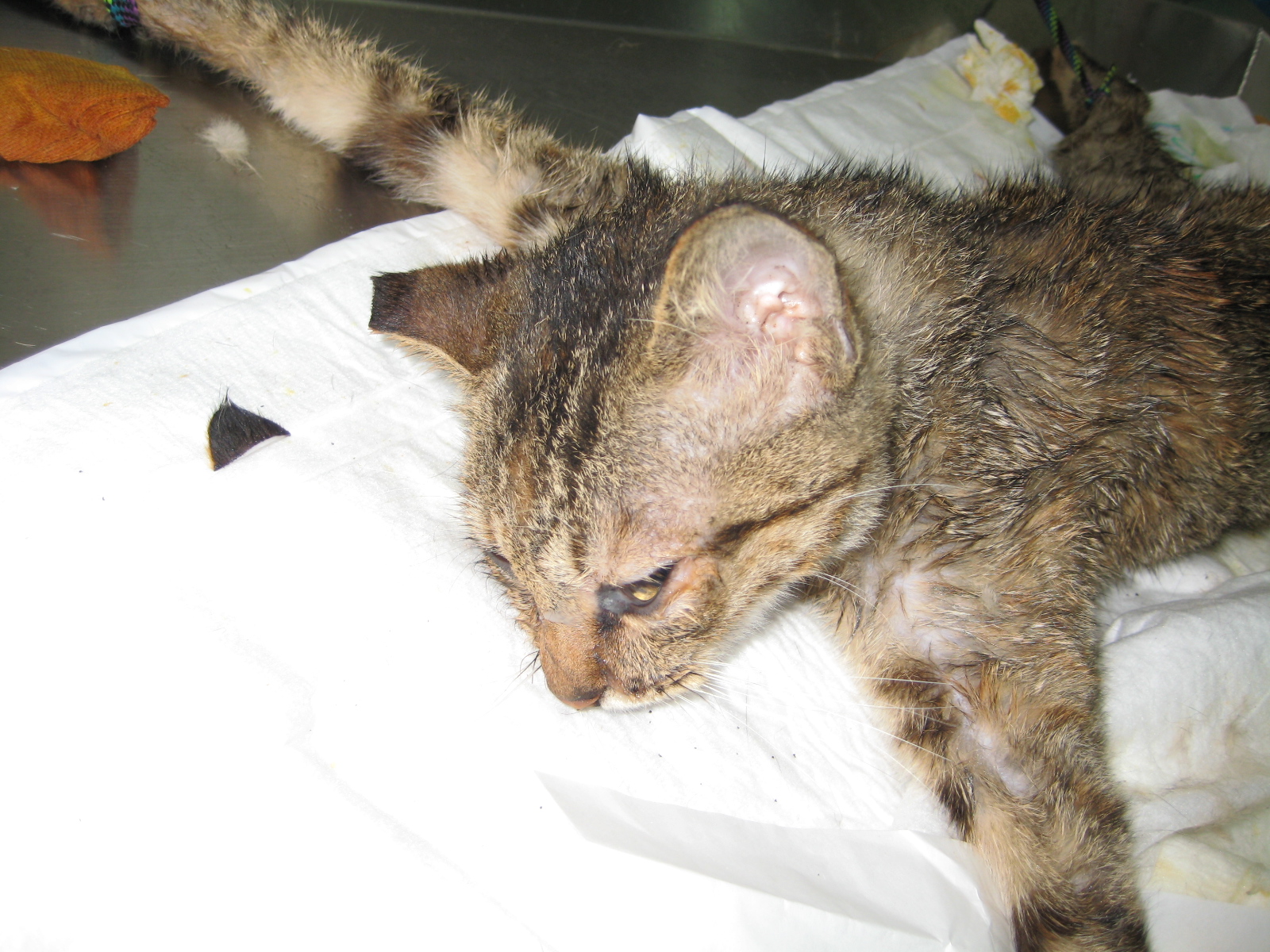 那邊的貓咪都有上呼吸道感染的問題,而且滿身的跳蚤,造成好幾隻貓有明顯的皮膚問題,其中一隻貓的嘔吐物發現,腸胃道裡有很多的蛔蟲,因此醫生為他們除蚤及做體內除蟲,希望他們放回時,是健健康康的。