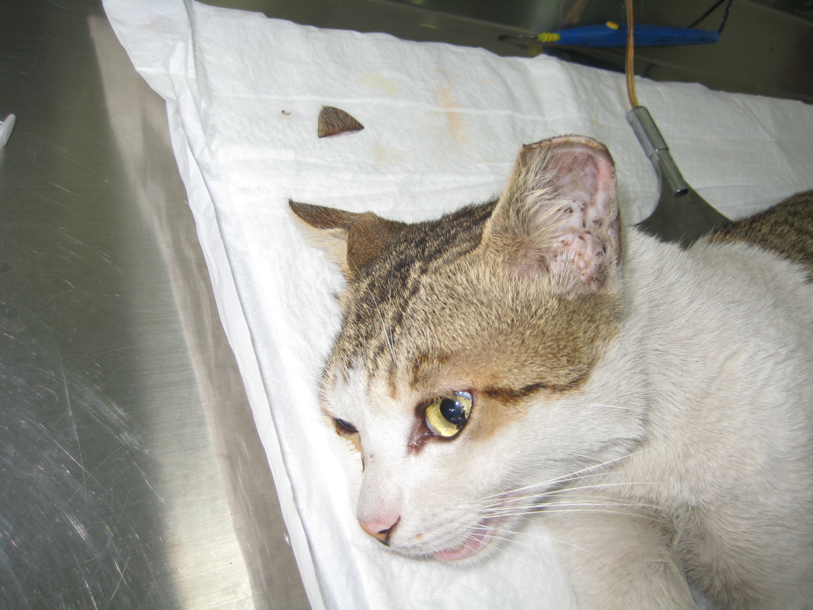 那邊的貓咪都有上呼吸道感染的問題,而且滿身的跳蚤,造成好幾隻貓有明顯的皮膚問題,其中一隻貓的嘔吐物發現,腸胃道裡有很多的蛔蟲,因此醫生為他們除蚤及做體內除蟲,希望他們放回時,是健健康康的。