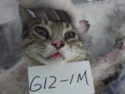 這是在天祥一路附近發現的新喵喵, 誘捕結紮, 腳上有傷還蠻嚴重的, 目前治療中. TNR的貓會在耳朵做剪耳記號, 以免日後被重覆誘捕手術 <612-1M>
