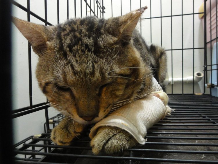 東園街巷,誘捕結紮的大公貓..,提起來很有重量,結紮手術時察覺到左前肢有打架的化膿傷口.蜂窩性組織炎..治療中...