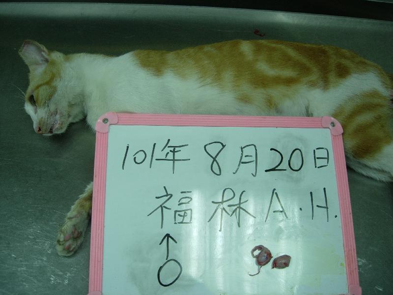 誘捕者暱稱: chia ying 性別: 公 花色: 橘白 誘捕地點: 永和 結紮醫院: 福林動物醫院 結紮費用: 800 助紮者: 已付款:Miss.Sx1, 潘妤柔x1, Juwan Liux1 額外醫療費用申請: 特別說明與誘捕心情: 貓友Kurt Tung向紮貓組長Akimasa Tu通報四號公園附近某條防火巷有10多隻大大小小的貓咪,地緣志工前往勘查,約有20隻貓咪,看起來都還算飽足健康,不知是誰在餵養但是缺少結紮觀念,這區陸續結紮中,Kurt Tung非常有心,不願透露姓名,已先自付4隻結紮費給醫院,感謝所有助紮人士,相信這區的貓咪全紮完後,牠們應該可以快樂的在此生活。