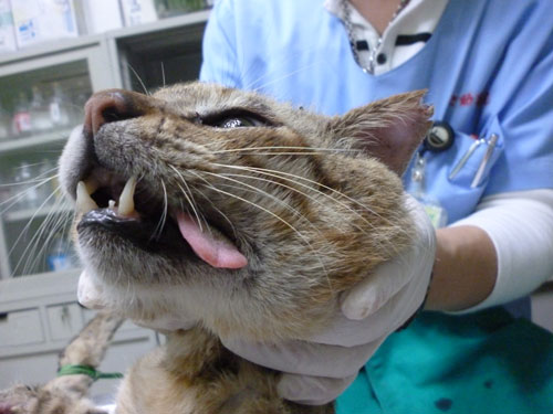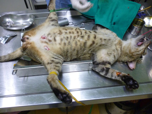 這隻大虎斑公貓很大隻,圓圓壯壯,在籠子裡一直飛機耳,麻醉後醫生發現他身上多處傷口,應該是打架受傷,前腳腳掌潰爛切除一小部份,耳朵和頭上也有傷,還有鼻氣管炎,需住院治療,等出院後會申請醫助。
