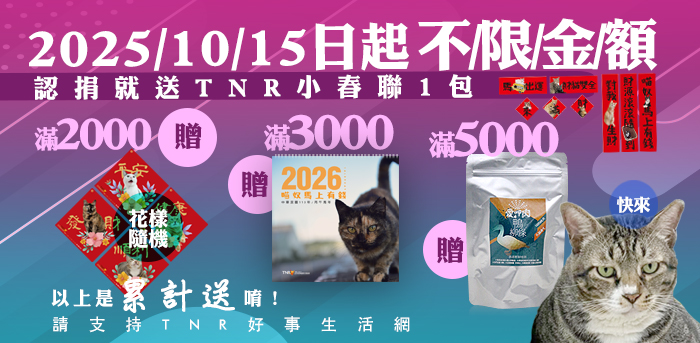 社團法人臺北市支持流浪貓絕育(TNR)計劃協會 版權所有 ©2011-2025. All Rights Reserved. 衛部救字字第1131364227號(期間114/01/01-114/12/31) TNR節育、醫療、助罐、對帳、收據、小額捐、贊助或是合作提案 地址:105台北市松山區八德路三段74巷13弄8號1樓